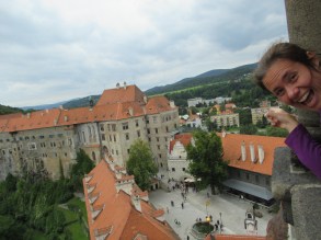 IMG_0365 Published 08/25/2014 at 3264 × 2448 in Český Krumlov, Czech Republic ← Previous Next → Della is pointing at the building our flat is located in