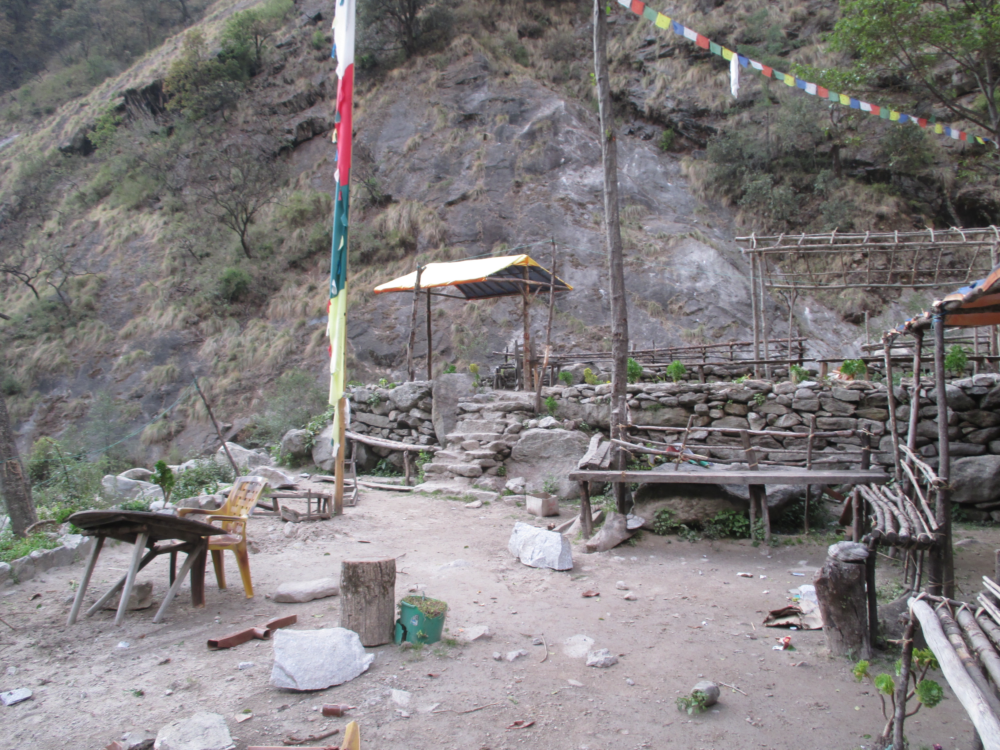 IMG_7808 Published 05/10/2015 at 3264 × 2448 in During the Nepal Earthquake: Our Experience ← Previous Next → Two days after the quake, we returned to the area where we were when the quake occurred. This is a picture looking up at the platform where we had been sitting.