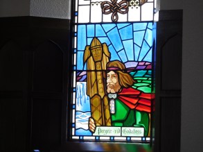 DSCN2575 Published 02/10/2018 at 2272 × 1704 in Summer Trip to Iceland: Not Just Nature in the North ← Previous Next → A stained glass panel in the church shows the lawspeaker throwing the statues of the Norse gods into Goðafoss