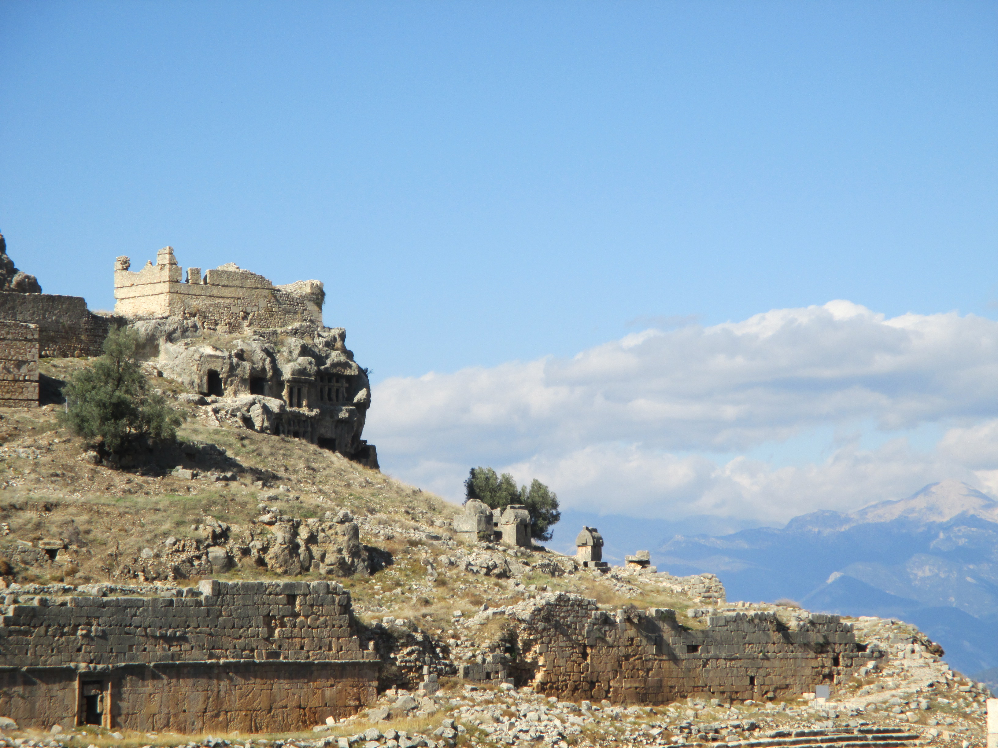 Tlos was one of the most important cities in ancient Lycia. It is a fascinating site because it has been pretty much continually occupied from the time of Lycia all the way up to the Ottoman Empire in the 19th century! It has the distinctive rock tombs of Lycia, as well as an a Roman-era acropolis, theater, stadium, and baths. In addition there are Byzantine church ruins and an Ottoman-era fortress atop the peak. Another thing that makes Tlos impressive is its absolutely awesome setting, situated in the foothills of the Akdağlar mountain range.