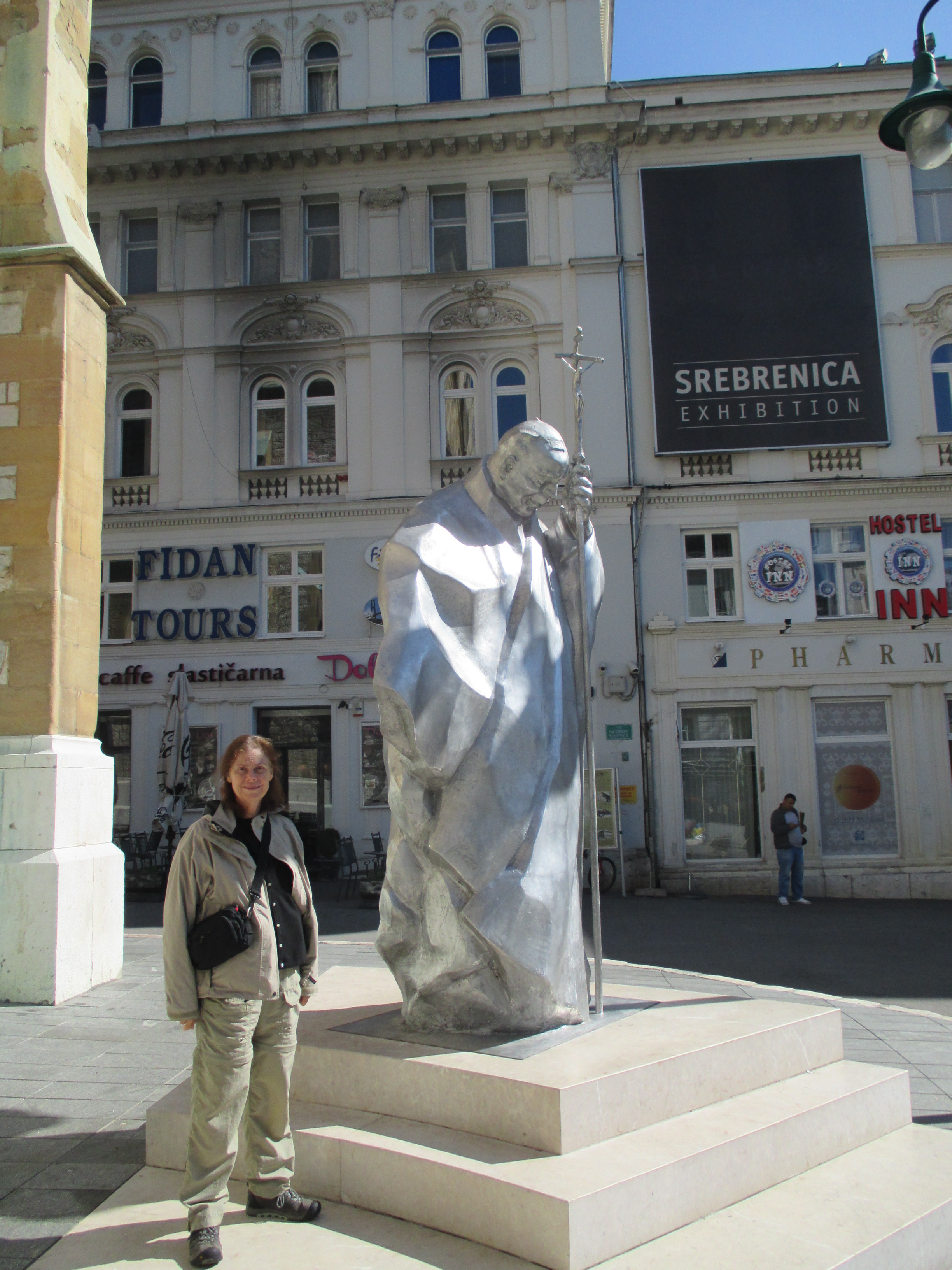 We paid a visit to thisย moving and disturbing exhibit in Sarajevoย โ a series of exhibits that attempt to explain some of the tragedies of the war, mainly the genocide at Srebrenica. Our guide gave us a brief overview of what happened there. Itโs hard to give a concise explanation in this space, but the gist of it is that over 8000 Bosniak people in the town, mostly males, were killed and dumped into mass graves by the approaching Army of Republika Srpska, even though the town was supposedly under UN protection. We walked through the photo gallery, watched a documentary, and also listened to the stories of some individuals who were affected.ย The gallery also included a small display and a documentary on the siege of Sarajevo. We vaguely remembered that Sarajevo was in the news when we were kids, but I donโt think we realized the scope of what the town went through. It was under siege for almost four years, which is the longest siege in modern history. The residents had to live in constant fear of being attacked by snipers in the hills surrounding the valley that the city sits in. The documentary, calledย Miss Sarajevo, was shot during the siege and showed the resilience of the residents in the face of this (and was later turned into a U2 song). It is extremely moving and worth a watch. (If you do watch the documentary, and you shouldโฆ it’s linked in the previous sentencesโฆ and you find yourself as taken with the young girl in the beginning and the end as we were, here is a video of what she was doing in 2009!)
